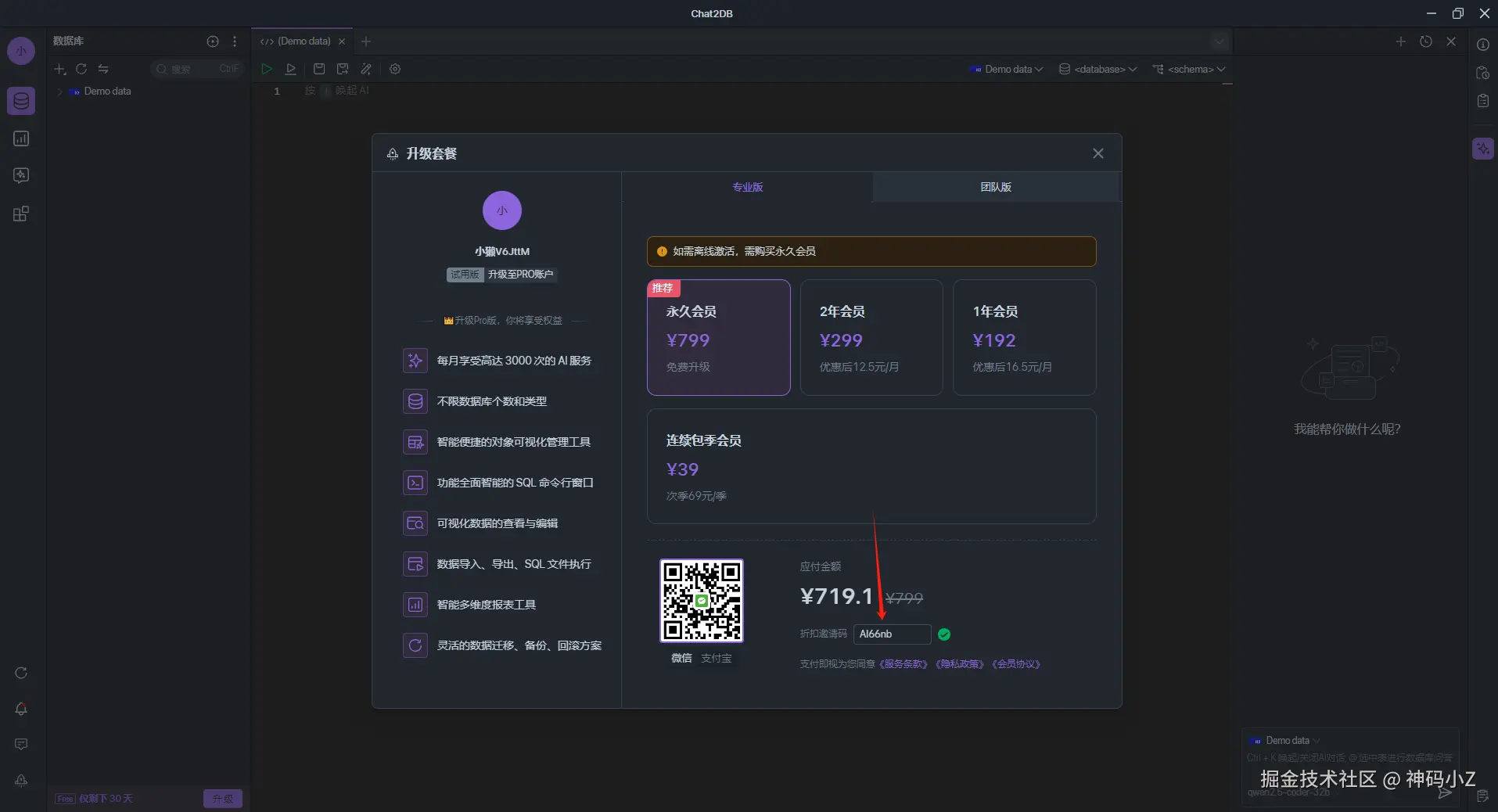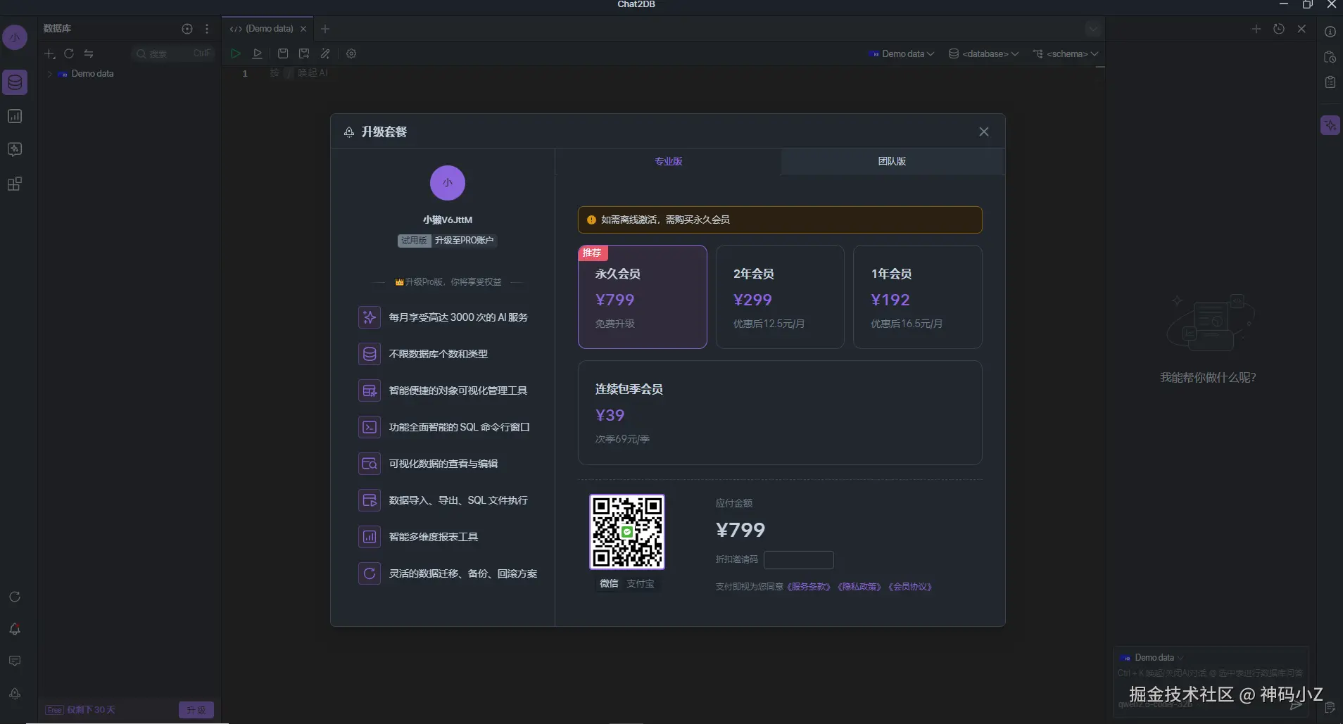 接下来,我将详细讲解下Chat2DB都有哪些功能以及如何下载使用!目前Chat2DB pro版推出了永久会员,如果已经下载的可以使用邀请码:AI66nb (AI66牛逼,是不是很好记!),会自动打9折!