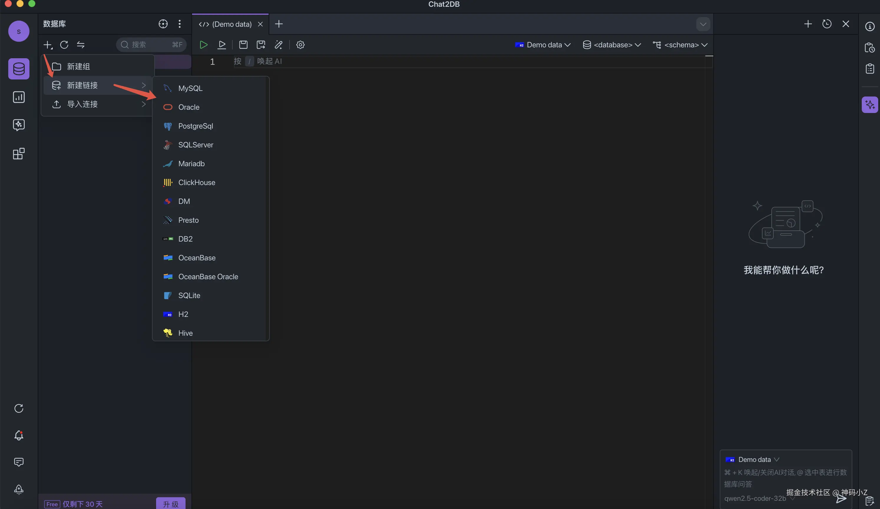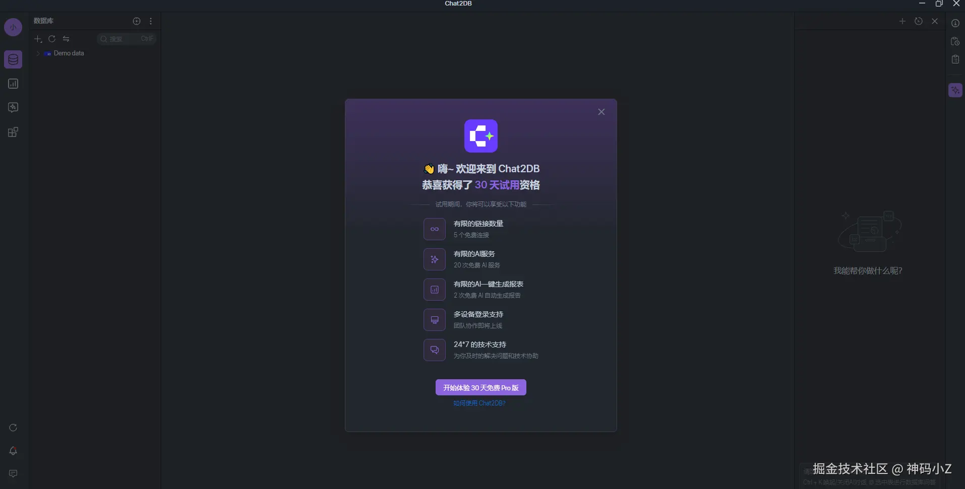 目前chat2db新用户都有30天试用期,过了试用期后如果想继续使用AI功能则需要订阅,不使用AI功能不付费也可以继续使用!