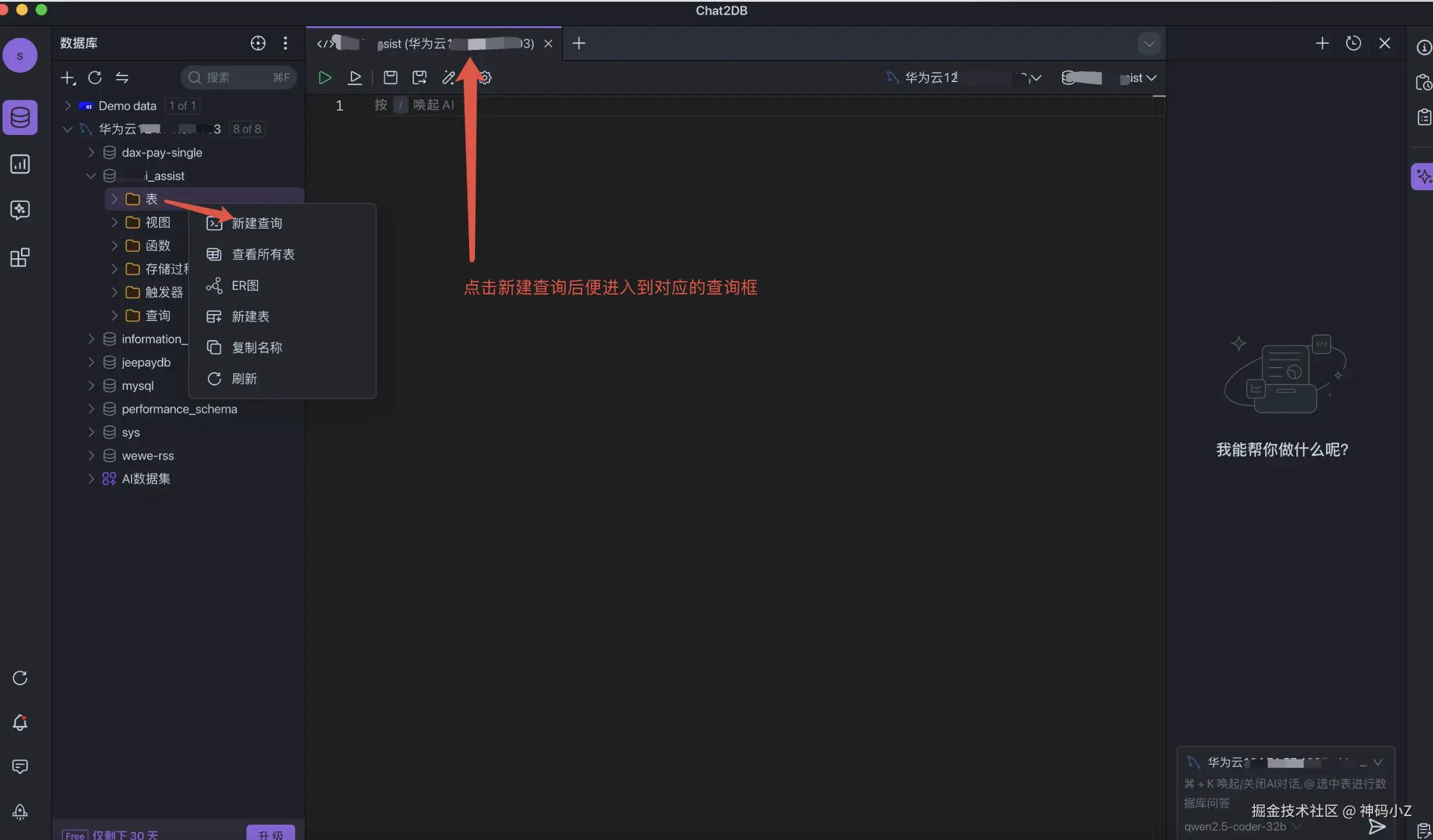 选择对应的库后,右键表,选择新建查询,即会新增操作窗口