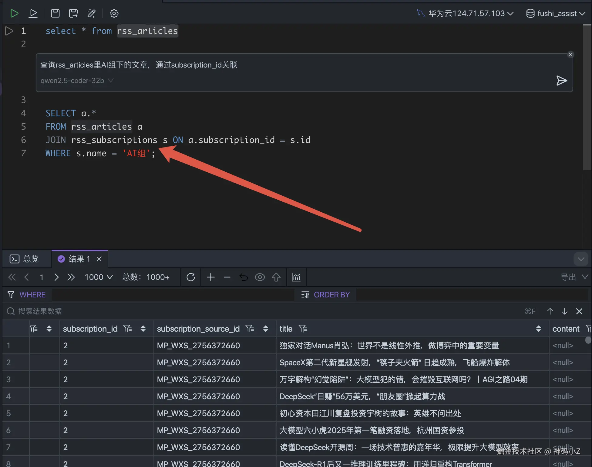 AI会自动扫描当前库下关联的表,并给出查询语句