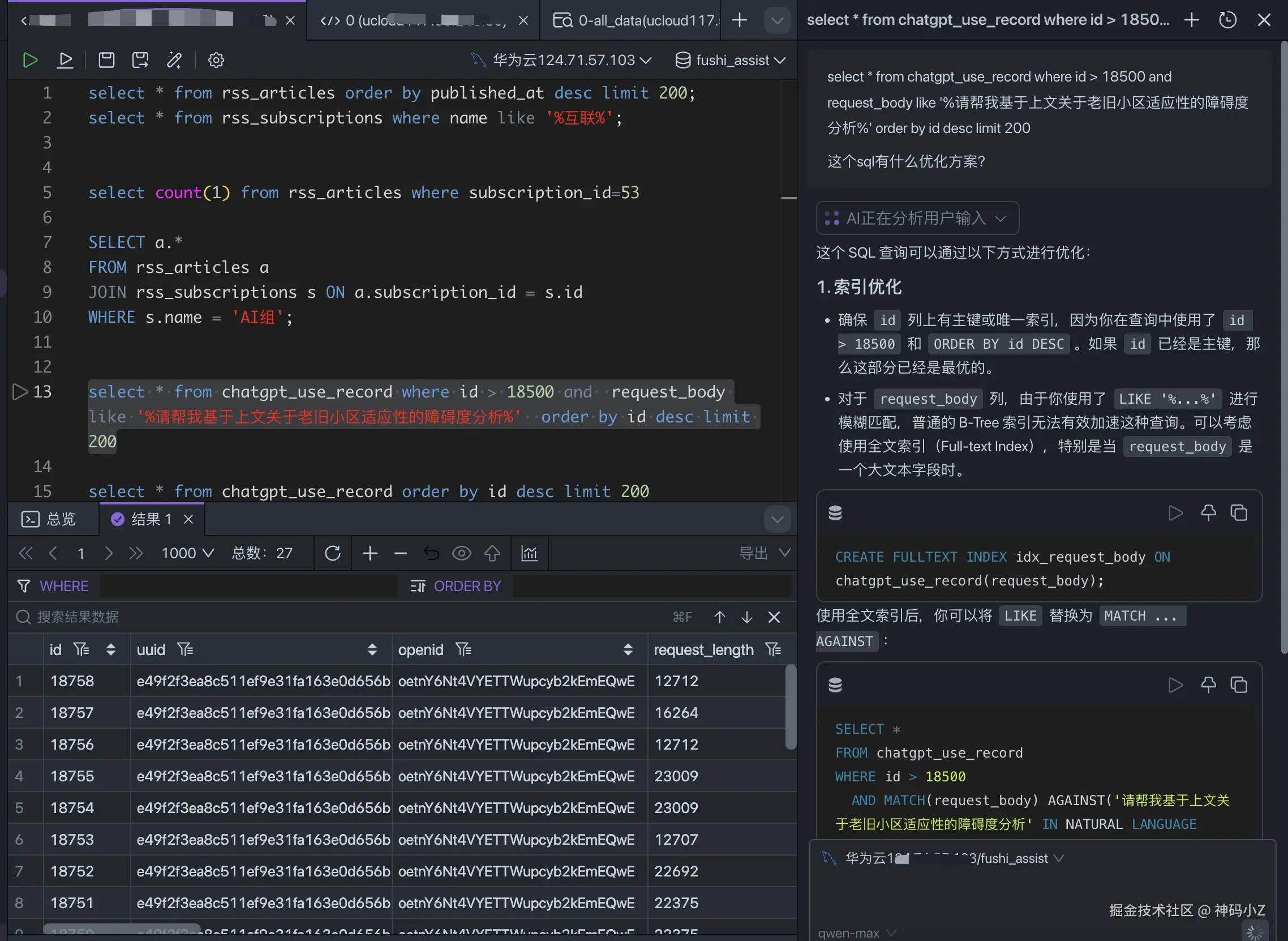 把要优化的sql拷贝到右边直接进行对话,它会自动扫描表结构,并给出优化方案!这速度也太高效了,再也不用拷贝表结构到别的AI平台问优化方案了!