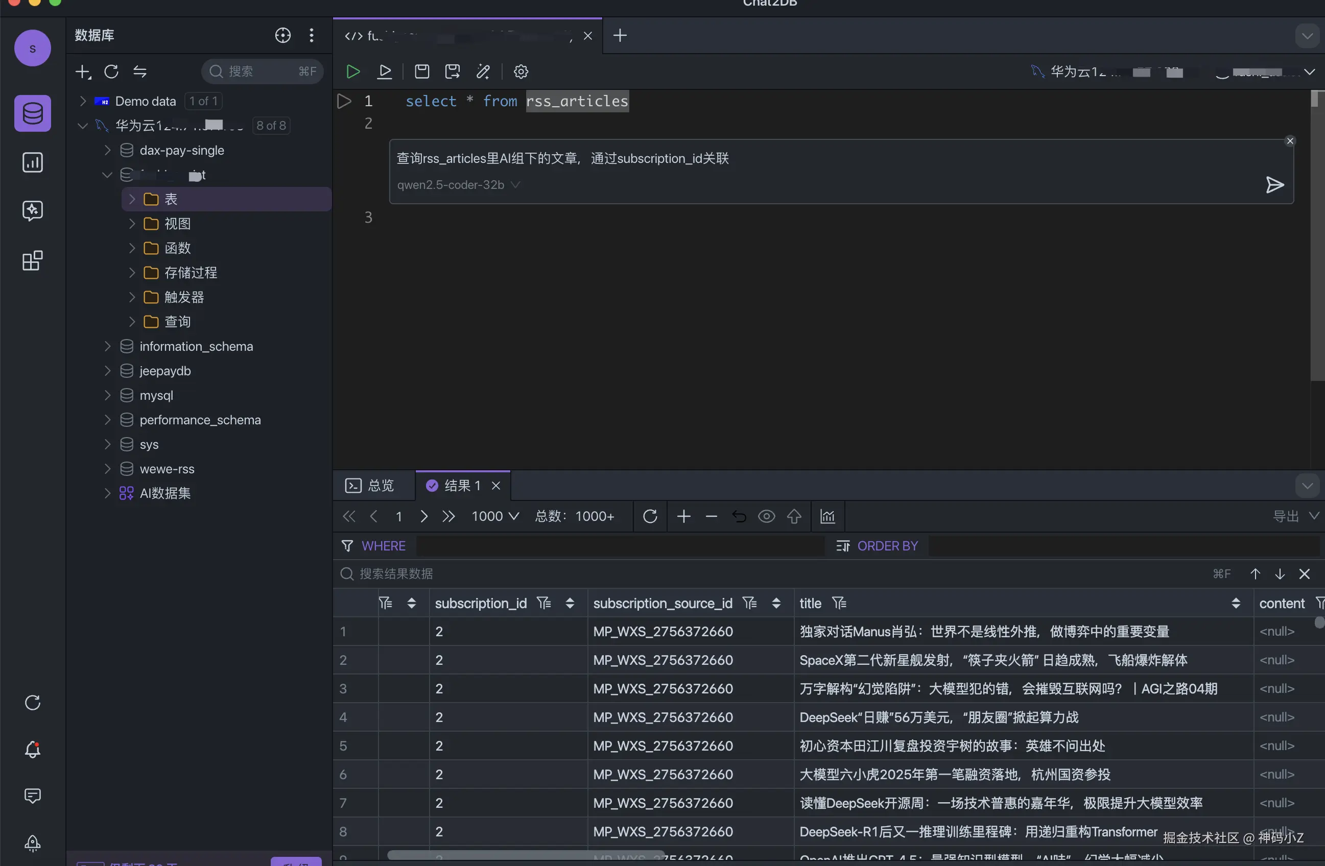 随着AI的发展,传统sql客户端将逐步被AI客户端取代,Chat2DB是sql客户端内目前业界做的最强大的工具,如果你正在寻找一款能够简化数据库操作、优化SQL语句并支持多种AI模型的工具,不妨立即下载试用Chat2DB,使用邀请码**AI66nb**享受9折优惠,体验其强大功能,让数据库管理变得更加轻松和高效!