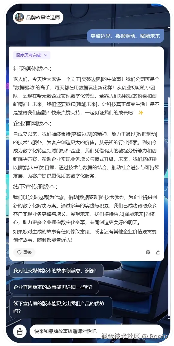 - 故事生成:基于对价值观的理解和渠道特点,运用 DeepSeek 模型的推理和生成能力,从不同角度构思品牌故事。通过大量的训练数据,让模型学习不同风格品牌故事的创作模式,从而生成高质量、符合要求的内容。