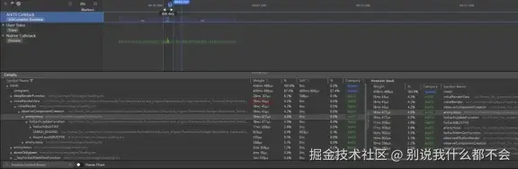默认为列表方式,其中,“Weight”字段表示当前所属函数的总耗时,“Self”字段表示函数自身耗时,“Category”字段表示函数调用类型。