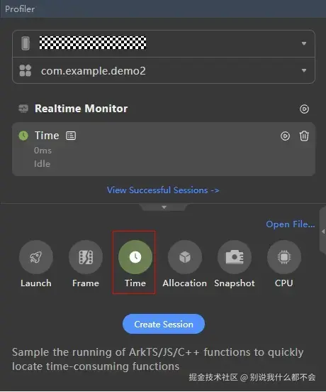 以DevEco Studio 4.0.0.400版本为例,在DevEco Studio菜单栏上单击****View**** > *Tool Windows* > *Profiler*,或者在DevEco Studio底部工具栏单击Profiler按钮,打开Profiler性能分析器,点选Time选项,再点击Create Session按钮创建耗时分析任务。