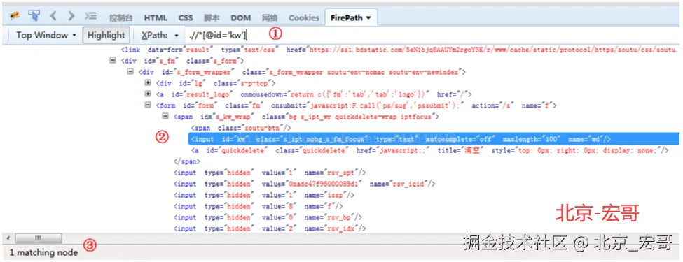 ②该元素节点的详细信息,XPath表达式选取重点区域