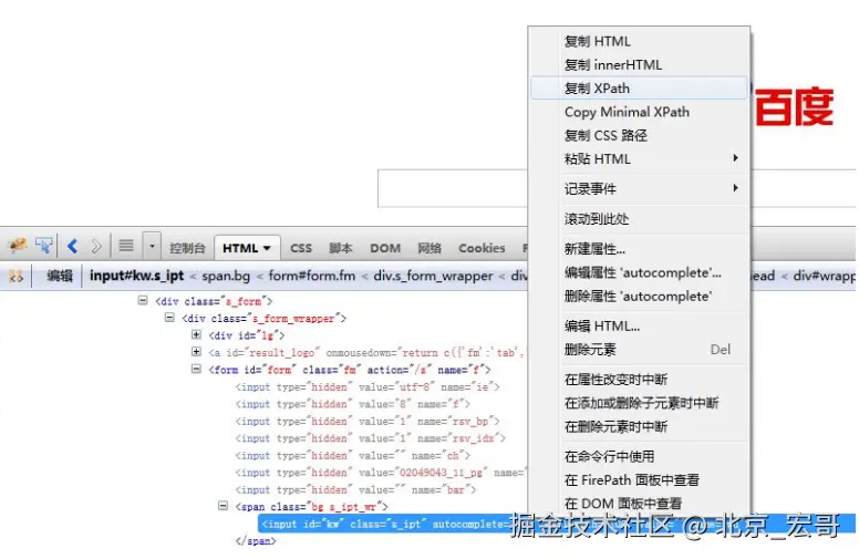 素行上右键弹出快捷菜单,选择“复制 XPath”,将会获得当前元素的 XPath 语法,如图: