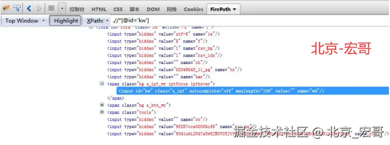 除了使用绝对路径的以外,XPath 也可以使用使素的属性值来定位。同样以百度输入框和搜索按钮为例: