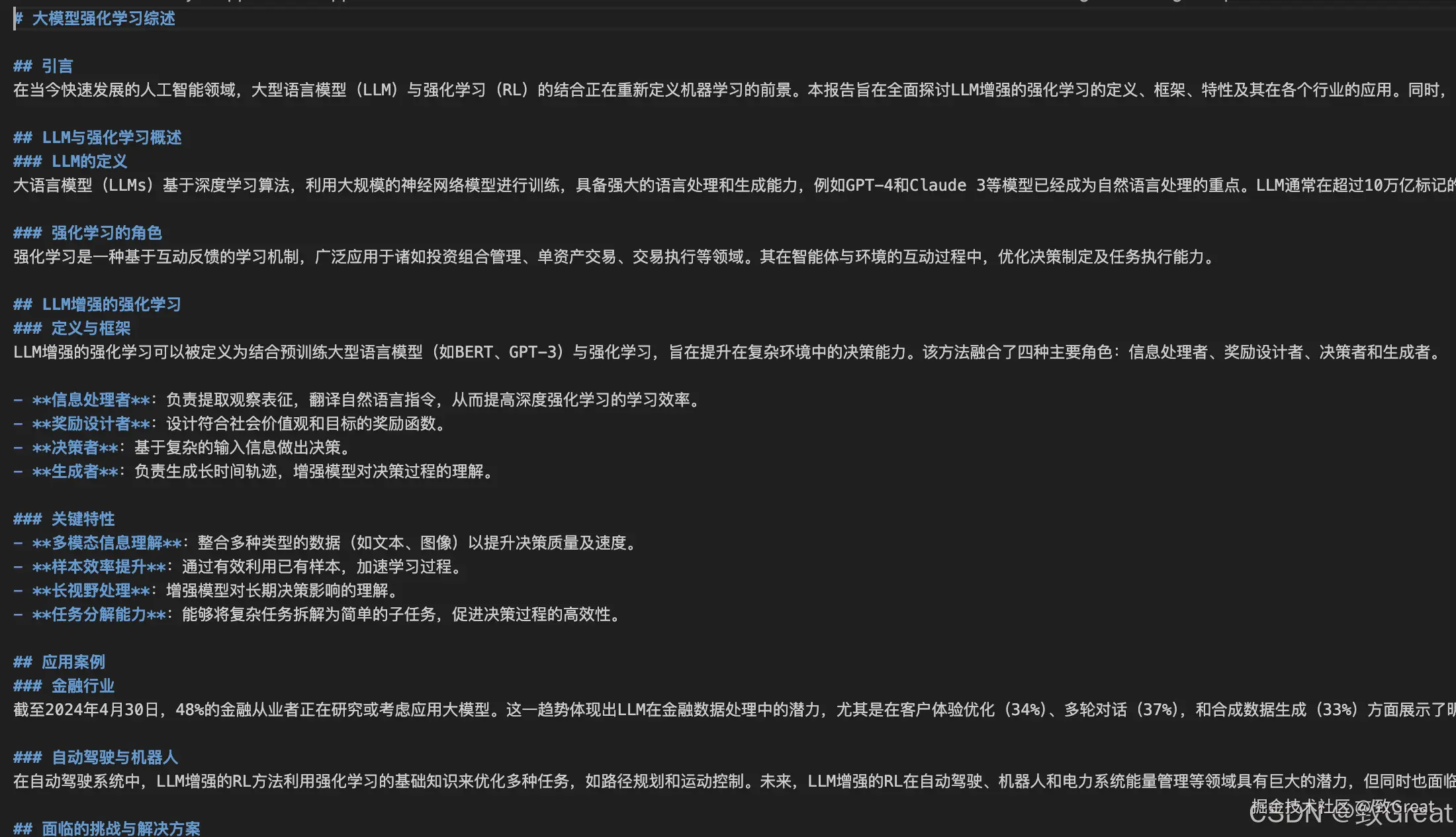 上图是最后生成的一个markdown报告,总体来说逻辑还算是正确的,形式相对可以。不过篇幅内容较短,关于“强化学习在大模型应用”阐释不够具体。