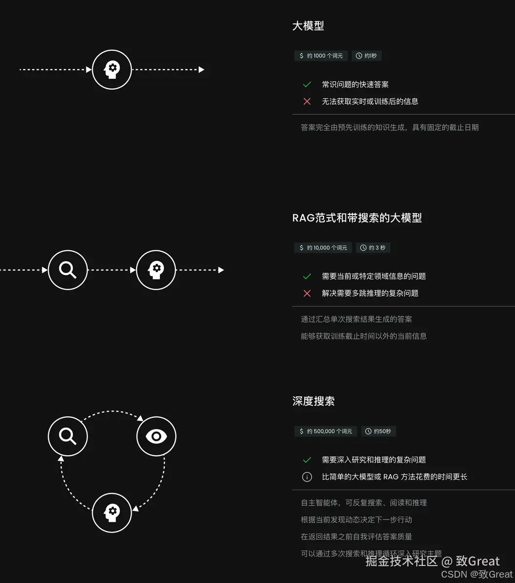 | 过程 | 直接生成答案 | 检索 + 生成 | 搜索-阅读-推理的迭代循环 | 自动研究,生成带引用的报告 |