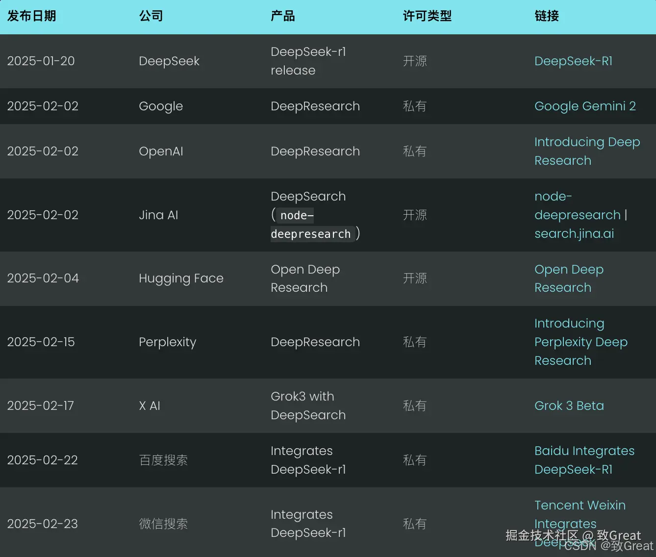 一个有趣的发现是,DeepSearch 和 DeepResearch 不仅限于 OpenAI,之前一直听说OpenAI的DeepResearch特别厉害,最近许多公司如 Jina AI、Perplexity 和 Google 也在开发类似工具。例如,Jina AI 推出了开源的 node-deepresearch,X AI 将 DeepSearch 集成到 Grok3 中,形成了DeepResearch 的变体。这可能表明AI 搜索和研究工具正迅速多样化,可能在未来几年内成为大模型的特色功能。