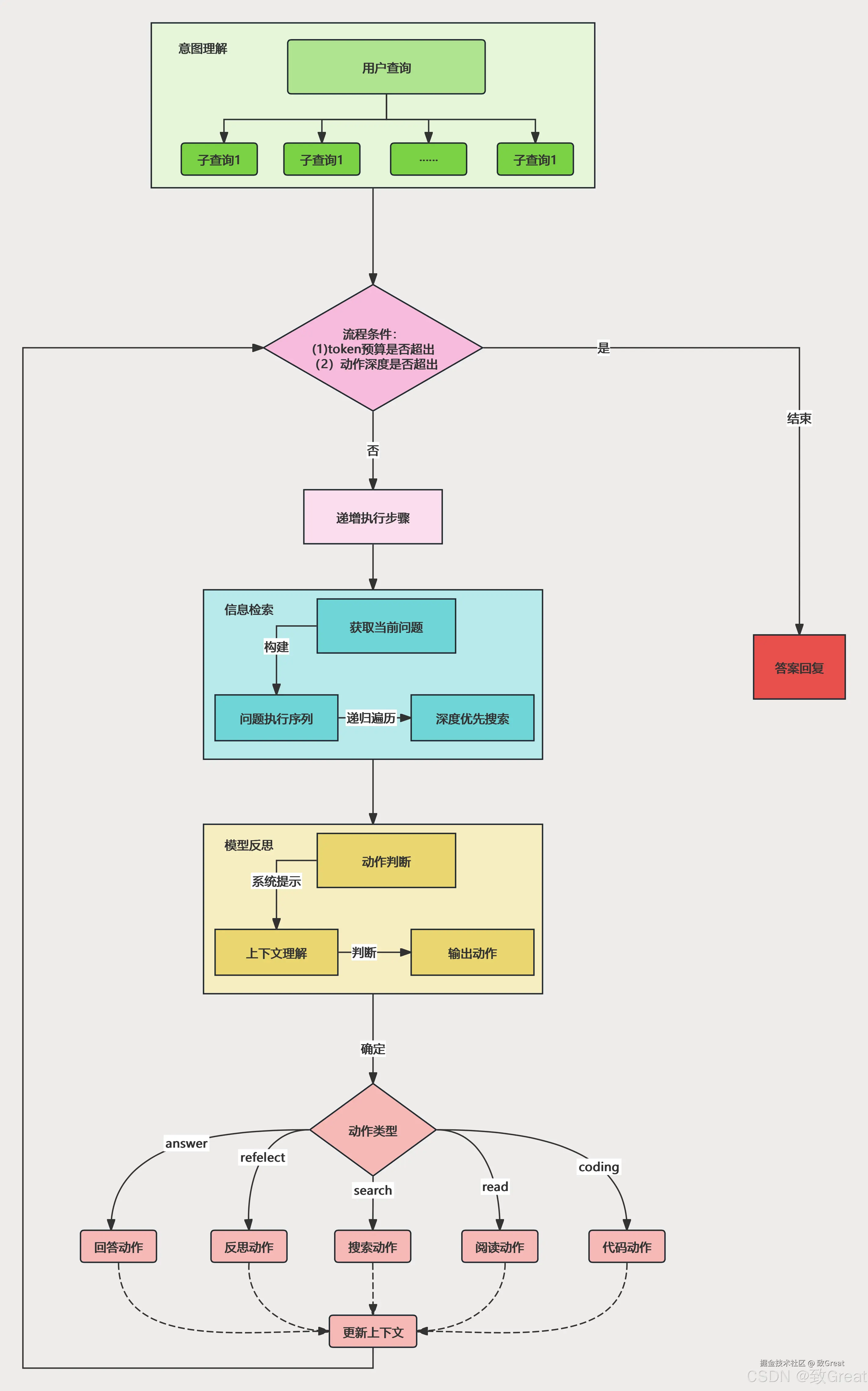 由于Jina开源的node-DeepResearch是Typescript开发,笔者在TrustRAG框架基础之上,用python实现了一个简易版本的DeepResearch,以下为实现逻辑。