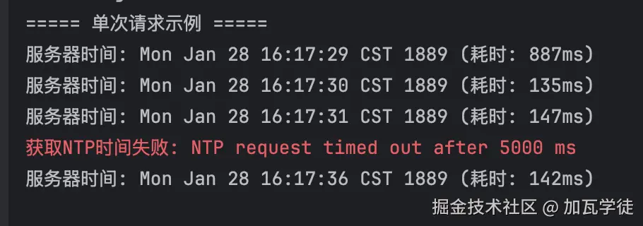 getNTPTime()都新建NTPUDPClient实例,导致100次循环中产生100次UDP套接字创建/销毁开销。增加了系统调用和资源分配消耗(如端口占用、内核缓冲区申请)。 - 高频率短间隔发送请求,就算端口你是复用的,但也会很快