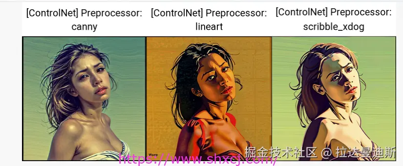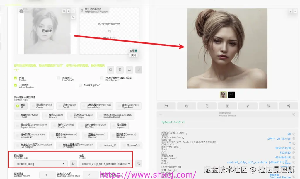 Scribble 涂鸦,也可称作 Sketch 草图,同样是一款手绘效果的控图类型,但它检测生成的预处理图更像是蜡笔涂鸦的线稿,在控图效果上更加自由。