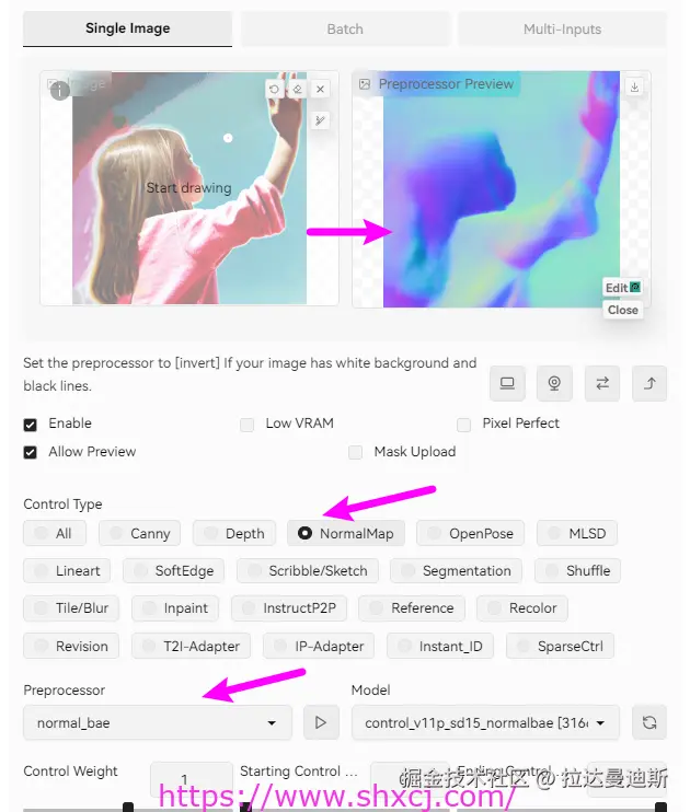 注意,这个方法比ControlNet 1.0中的normal-from-midas方法合理得多。以前的方法将被放弃。