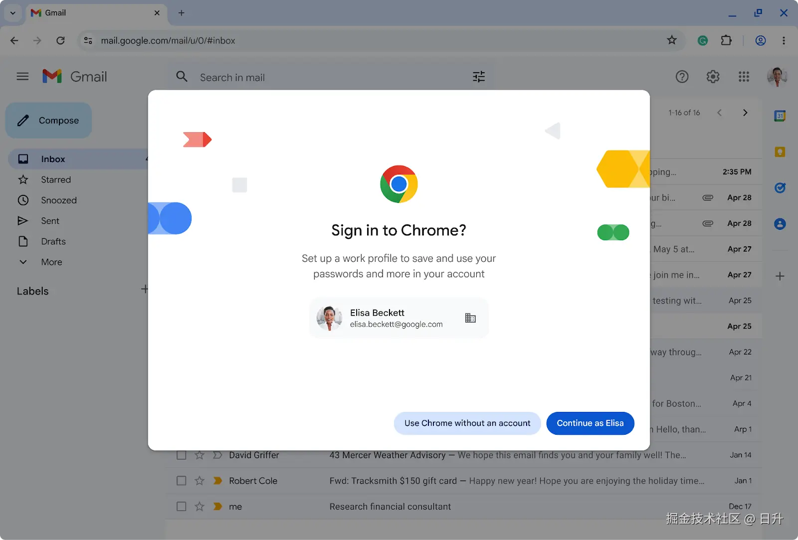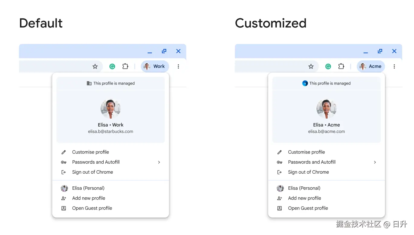 Chrome 推出了 新的工具栏和个人资料菜单自定义功能,帮助用户更容易识别 其 Chrome 个人资料是否受管理,无论是 工作设备 还是 个人设备。