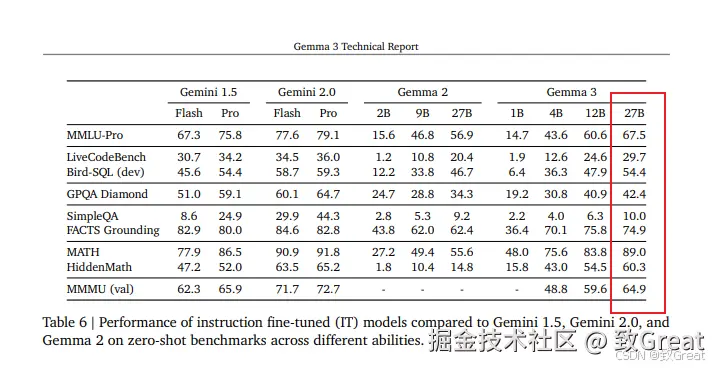 Gemma 3 在 MMLU-Pro(27B: 67.5)、LiveCodeBench(27B: 29.7)和 Bird-SQL(27B: 54.4)等基准测试中表现出竞争力,与封闭的 Gemini 模型相比性能相当。GPQA Diamond(27B: 42.4)和 MATH(27B: 69.0)等测试突显了其推理和数学能力,而 FACTS Grounding(27B: 74.9)和 MMMU(27B: 64.9)则展示了其强大的事实接地能力。
