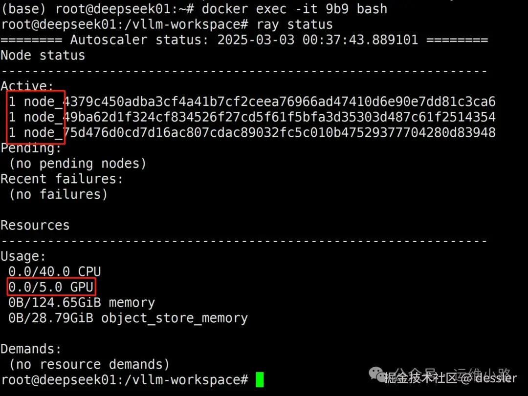 这里显示3个节点,总共6个GPU(下图是我只有5张卡的截图),显示以后就ray集群启动成功。然后3台集群6张卡组成了一个小集群。