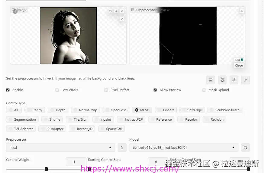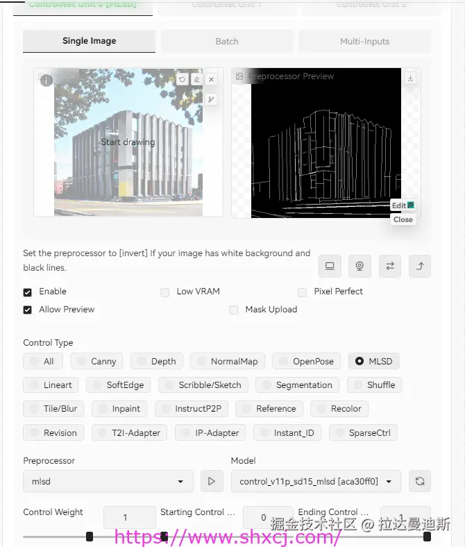MLSD模型是一个专门检测直线的模型,基于MLSD模型的特性,MLSD模型在建筑、室内方向的处理上是比较好的选择,可以很好的检测出原图的直线线条,可以从官方图中看到第一张,针对直线的抽取。