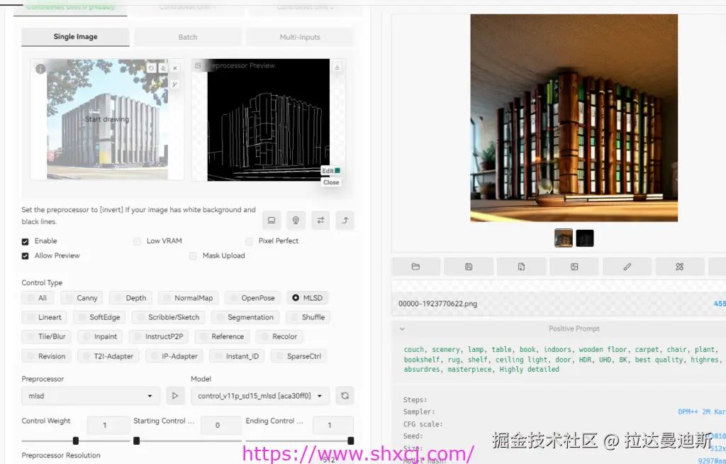 这篇文章会主要介绍ControlNet中的MLSD直线效果,可以很好的用在建筑和室内设计方向上。