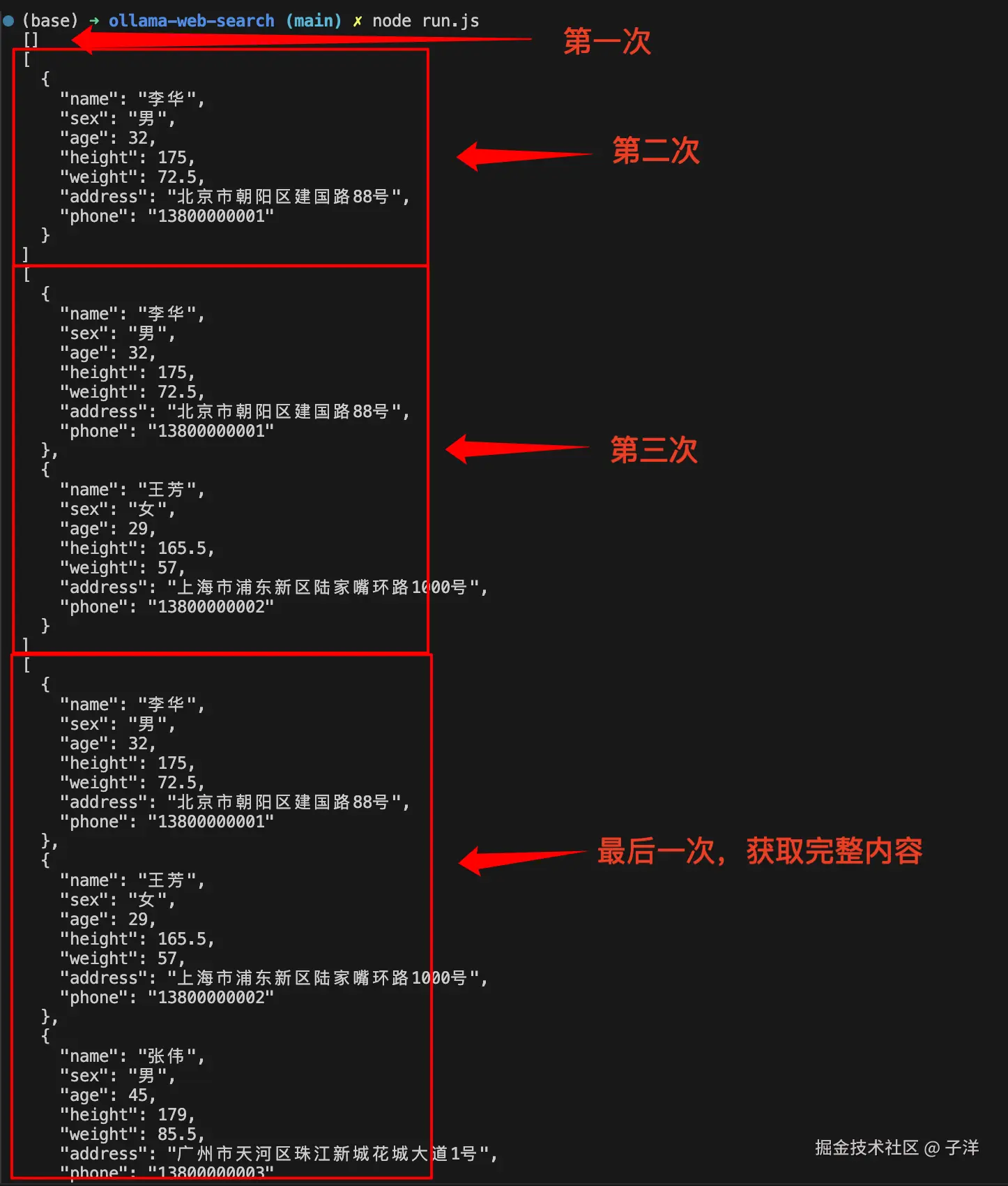 流式生成对象,参数和 generateObject 基本一致,这里不再赘述。通过遍历 partialObjectStream 获取每一次的 chunk,每次获取都是一个完整的对象。