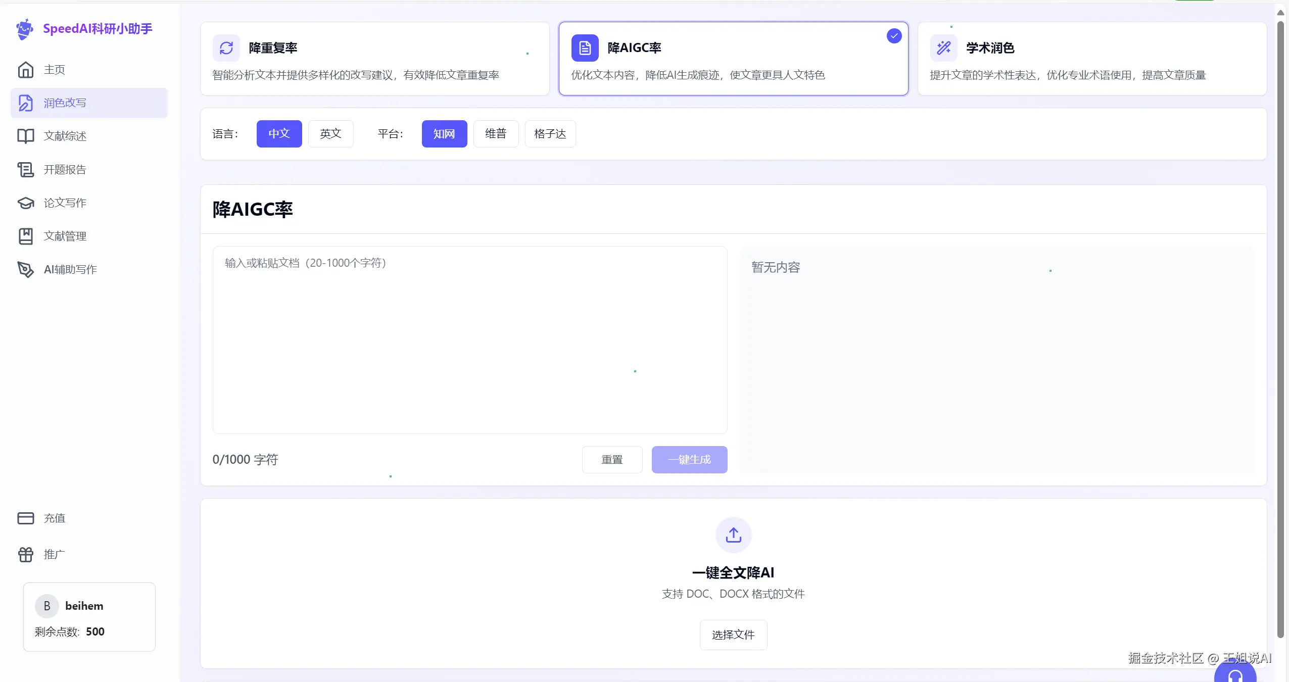 再看看早降重,这是一款降重工具软件,最近也加入了降低AI疑似率功能。它不像有些工具花里胡哨的,就只专注于降重这一件事,没有其他多余的功能,很纯粹,就像是降重领域里的“独行侠”,一门心思扑在降重上。