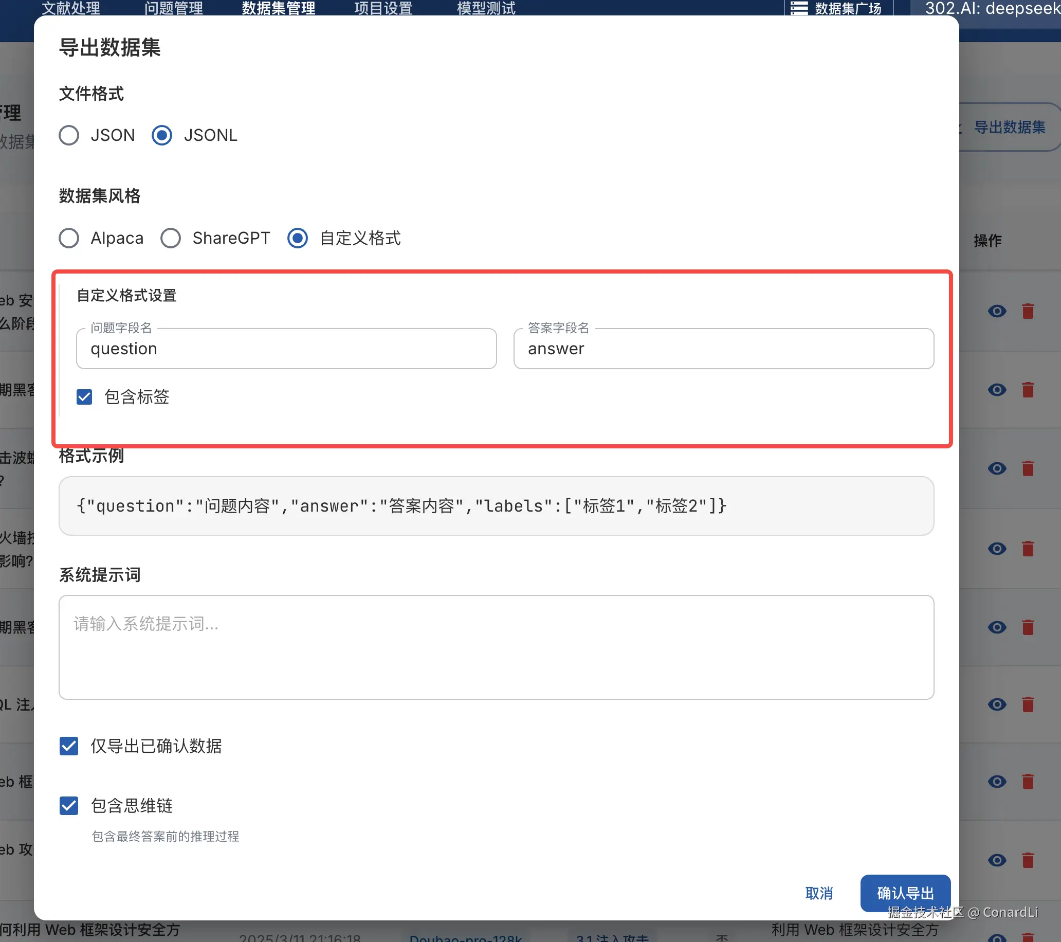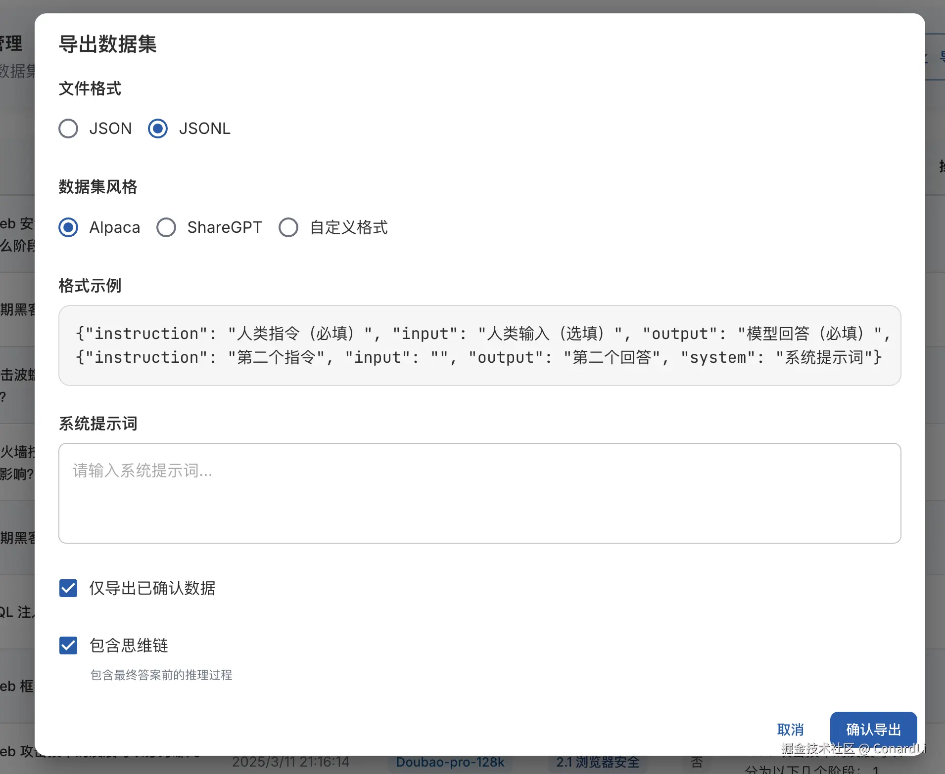 - 能够方便的对生成的数据集进行格式转换,比如 Alpaca 和 ShareGPT 格式