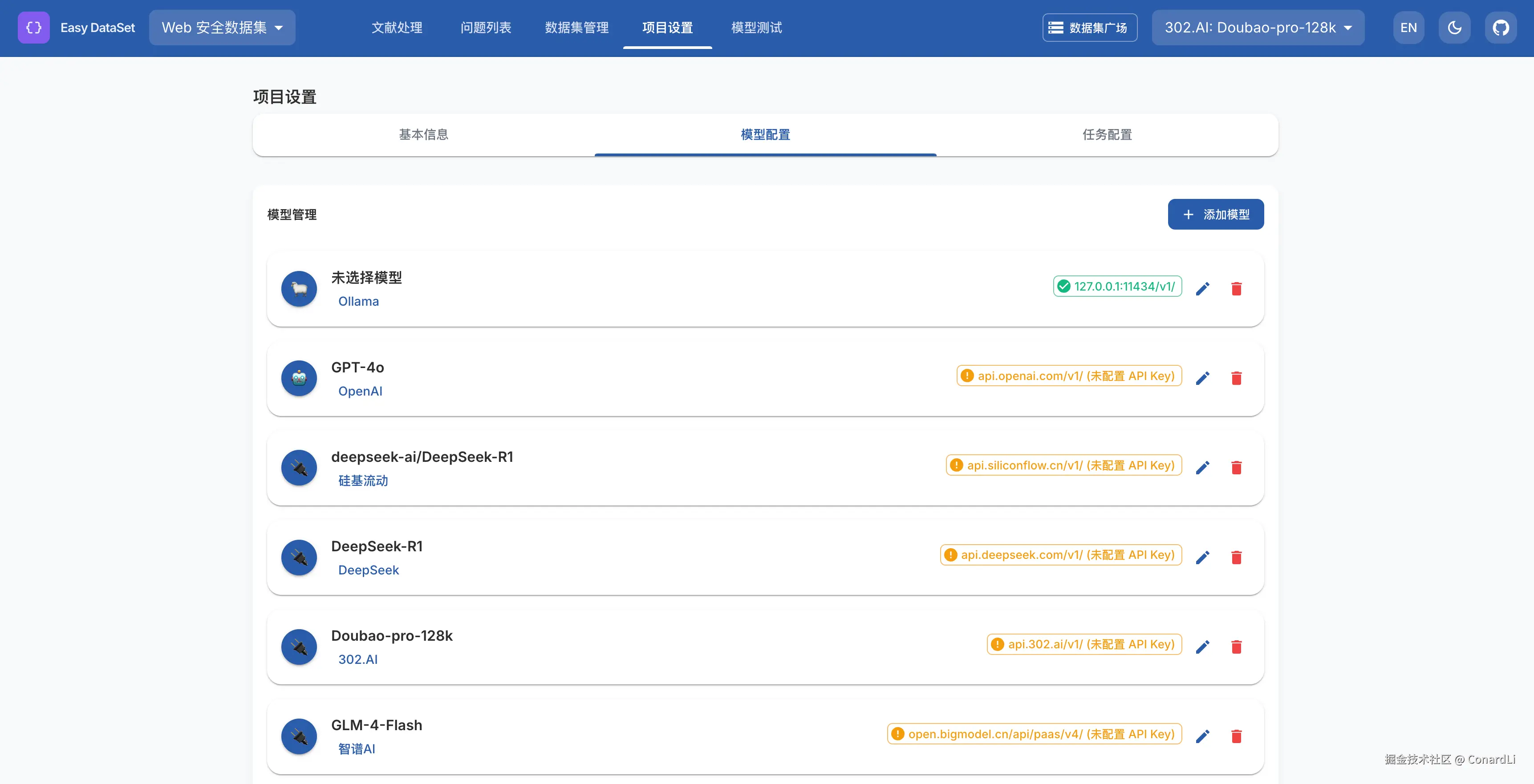 在这里我们可以配置后续用于处理文献和生成数据集的模型,比如选择 Ollama ,平台将自动获取你已经通过 Ollama 下载到的模型: