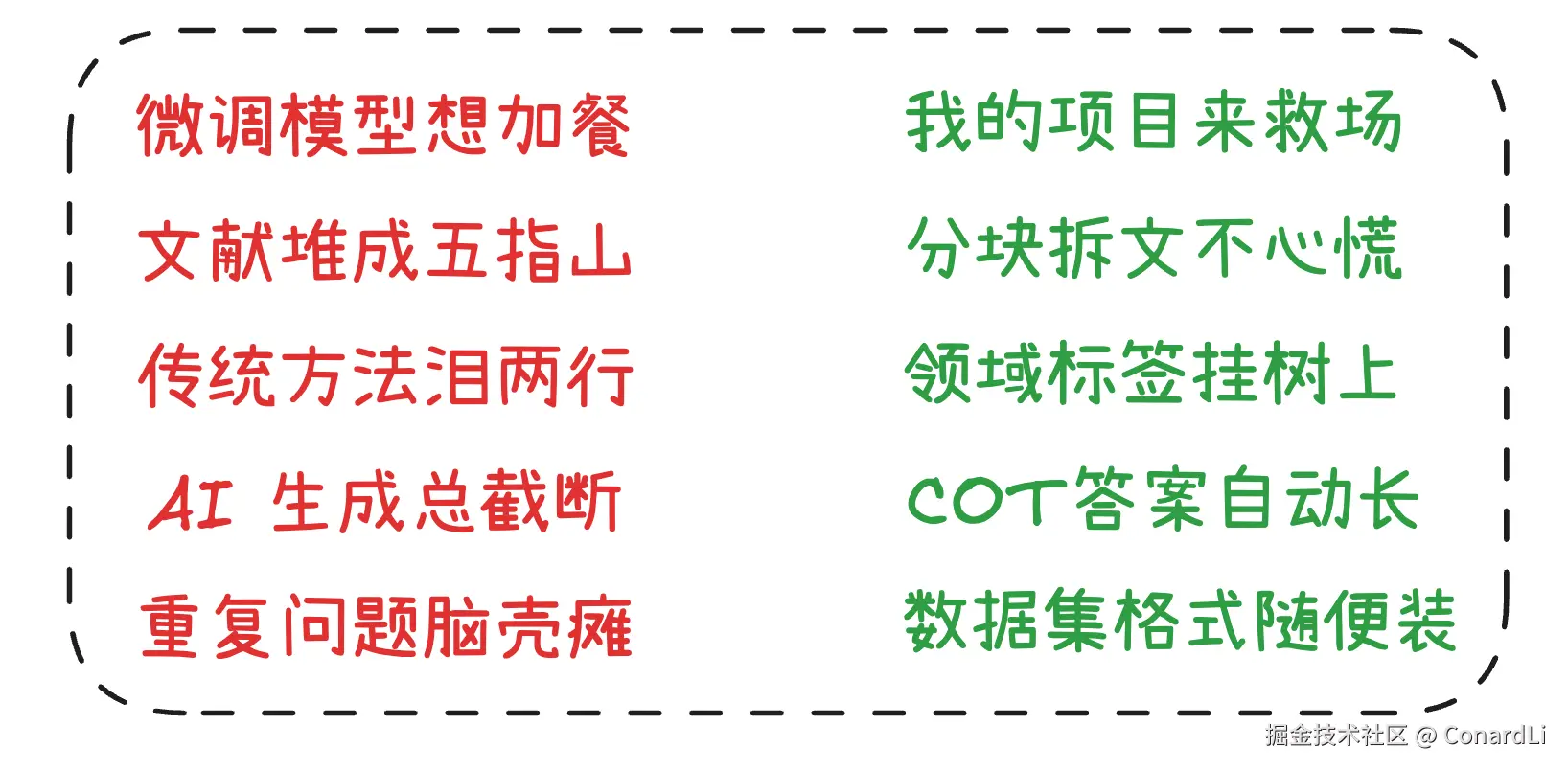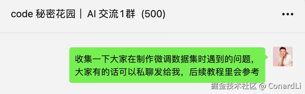 为了方便大家交流学习,我准备组建一个 AI 交流群,本文中微调案例中使用到的完整代码,我也会发到群里,想要在群里和大家一起讨论 AI 技术的小伙伴可以添加我的个人微信 ConardLi(备注 AI),拉你进群。