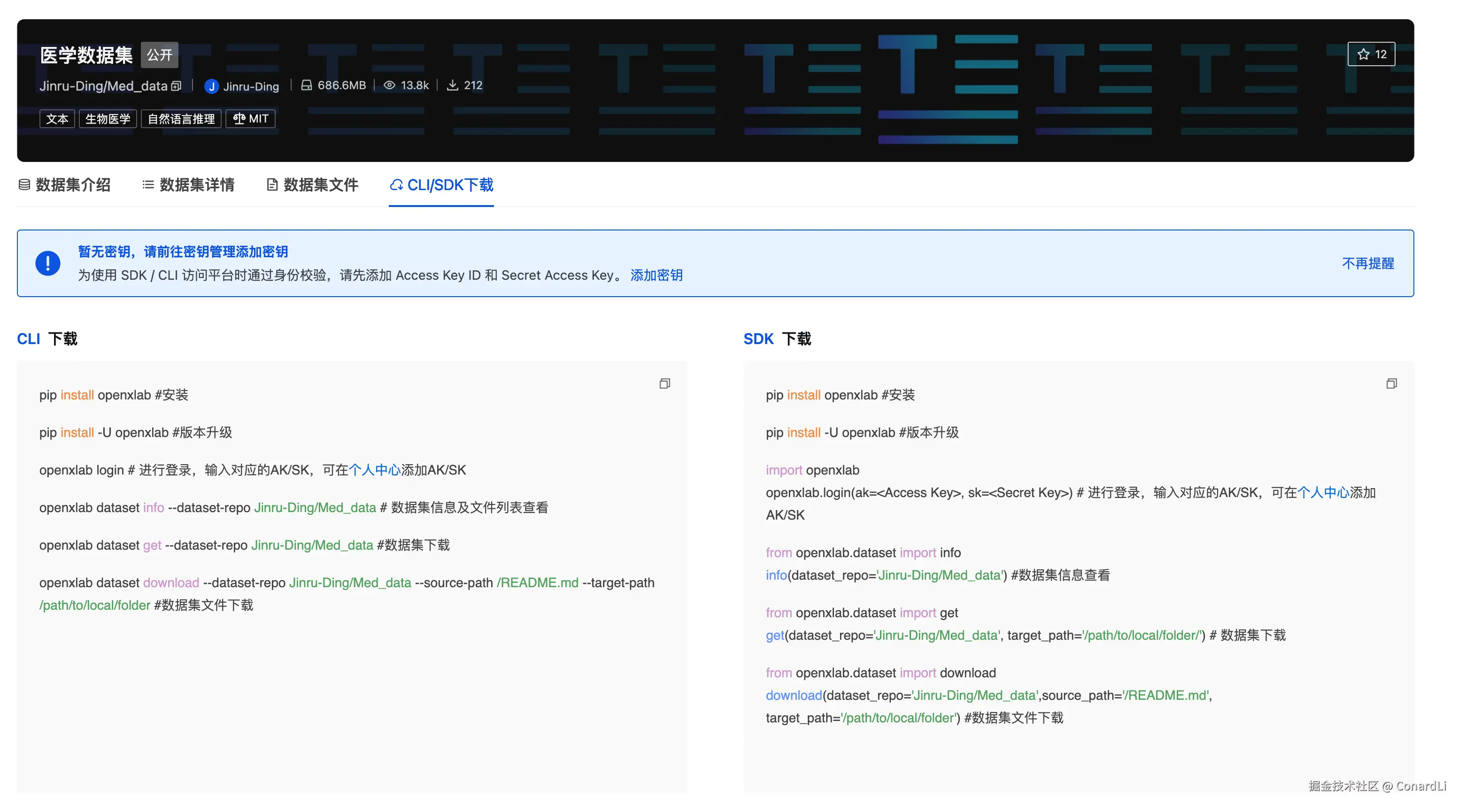 openDataLab 支持通过 CLI 和 Python SDK 下载,打开数据集详情后可以看到具体代码示例: