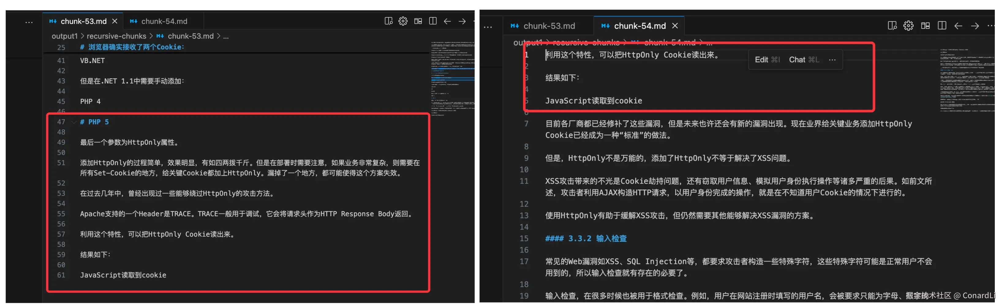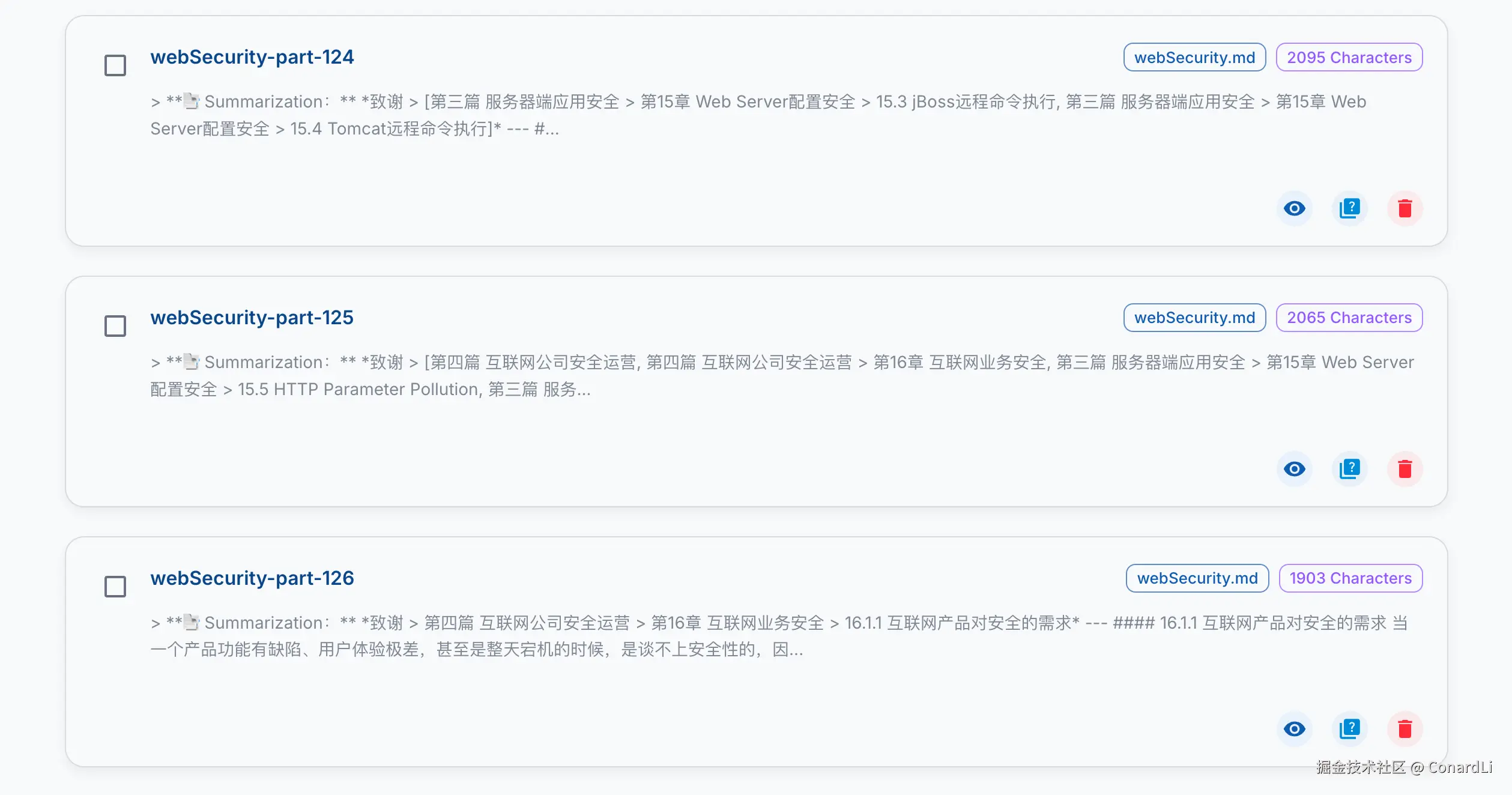 比如在对一个文件分割完成后,第 16、17 个文本块,我发现同一个章节被分割到了两个不同块里,因为这里的最小分割单元是一句话,不会考虑整个章节的问题:
