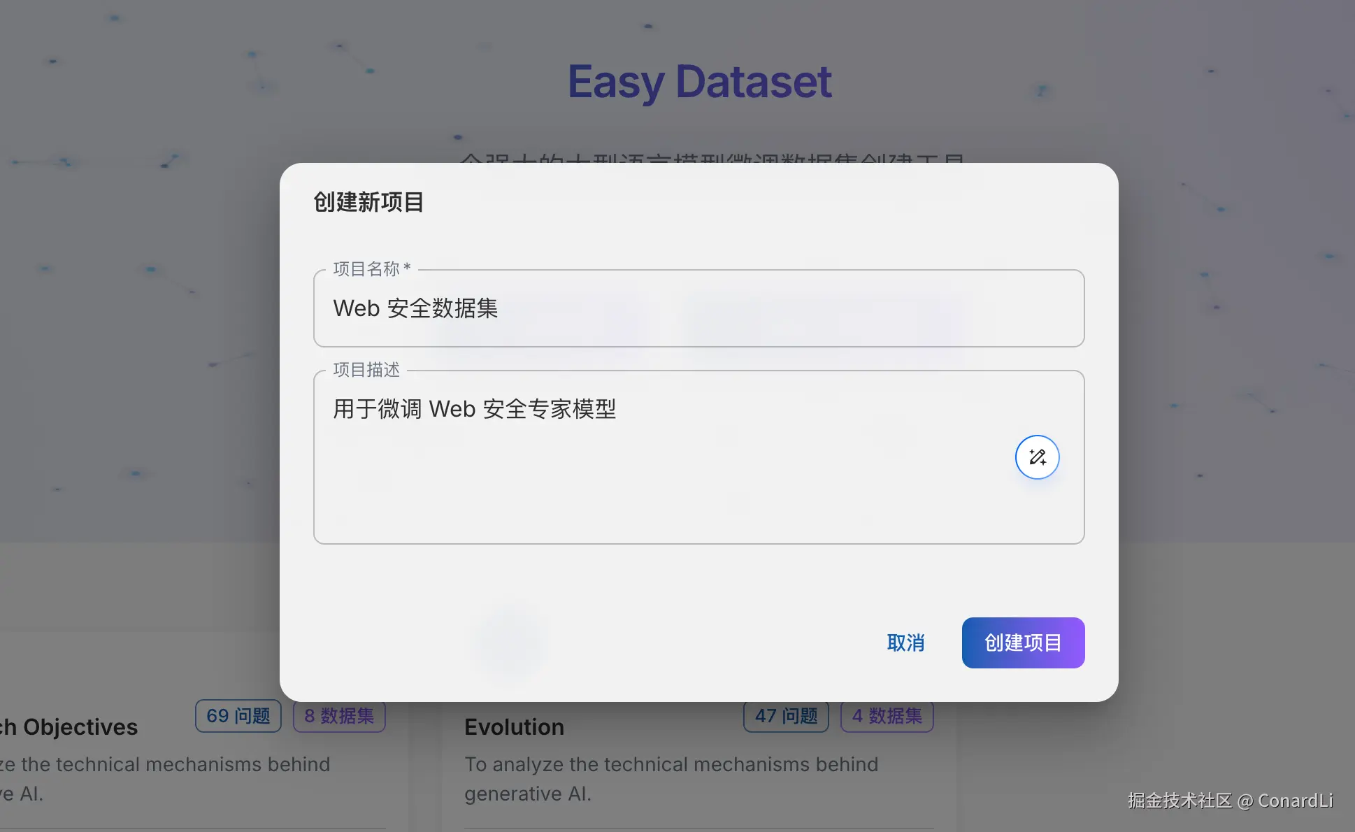 创建新项目,只需要输入项目名称和描述,名称和描述只用于记录和查看,不会影响后续的数据集生成任务。