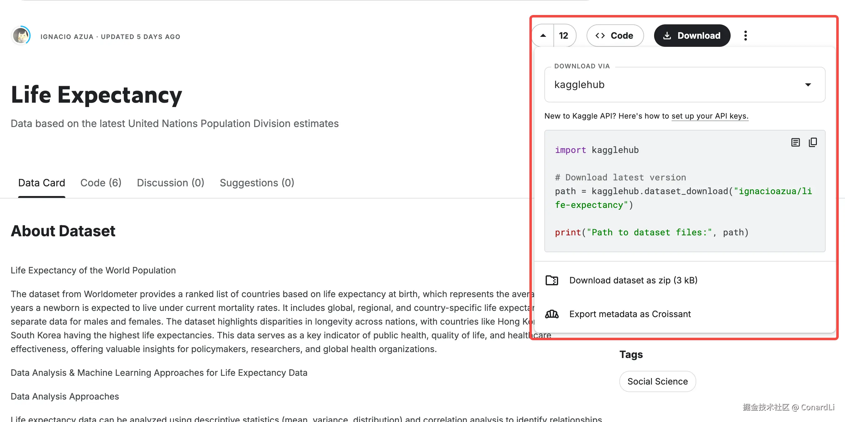 在数据集详情页,直接提供了下载 zip 包的方式,也可以通过 Python:kaggle datasets download -d <dataset-name> 进行下载。