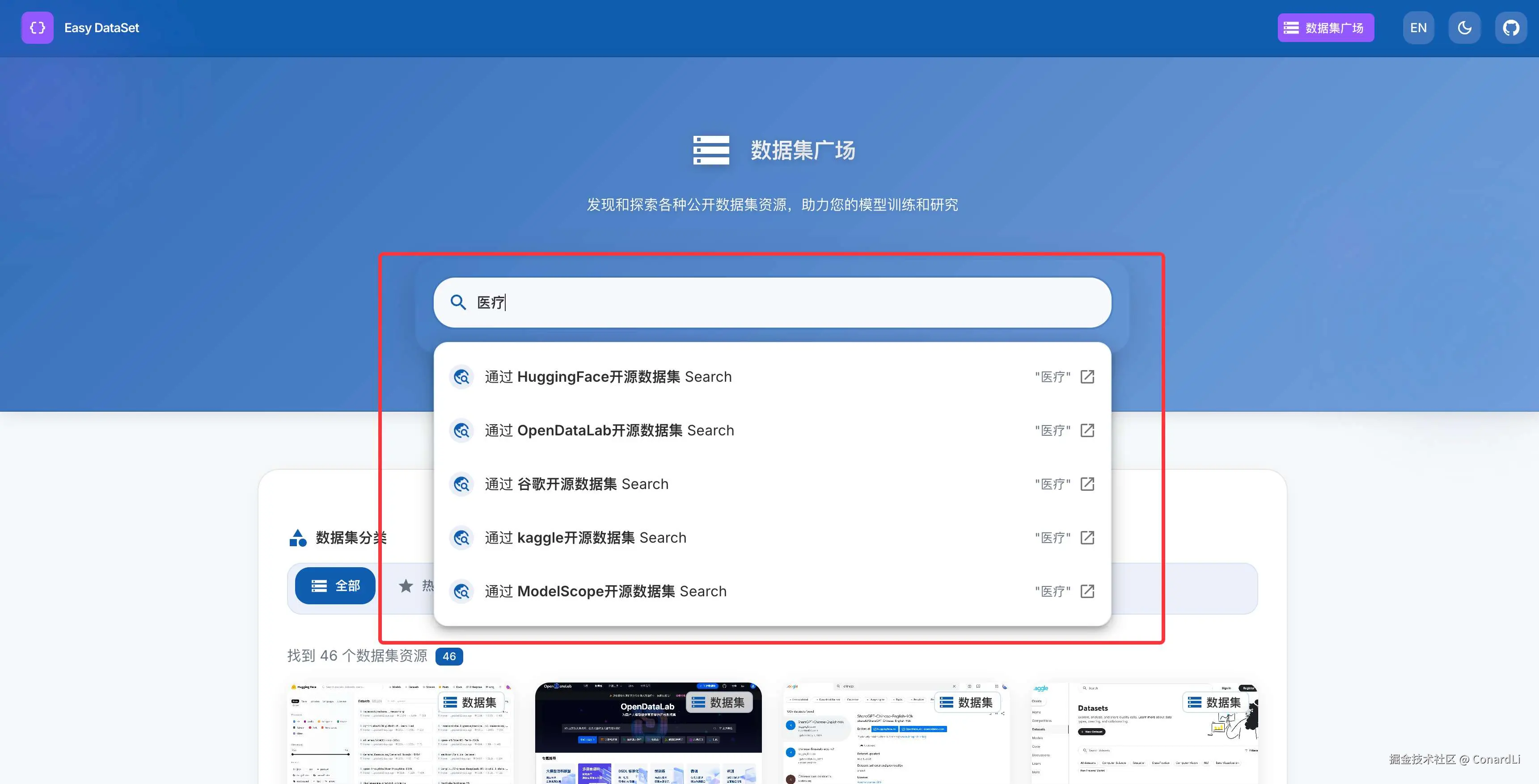 上面我们提到的各种检索公开数据集的途径,我直接聚合在这个模块里了,大家只需要在这个搜索里输入关键字,就可以快速在多个平台进行检索: