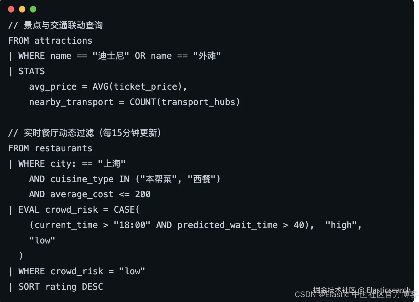 | SQL-like Queries (SQL查询) | ✔(支持ESQL和SQL查询) | x |