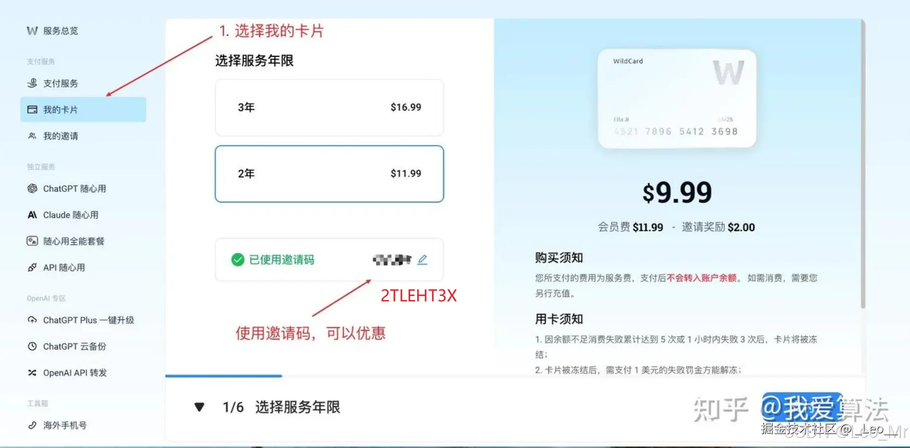 (6) 进入后台,点击左侧导航栏中的“我的卡片”。选择卡片使用期限,并扫码支付虚拟信用卡年费。