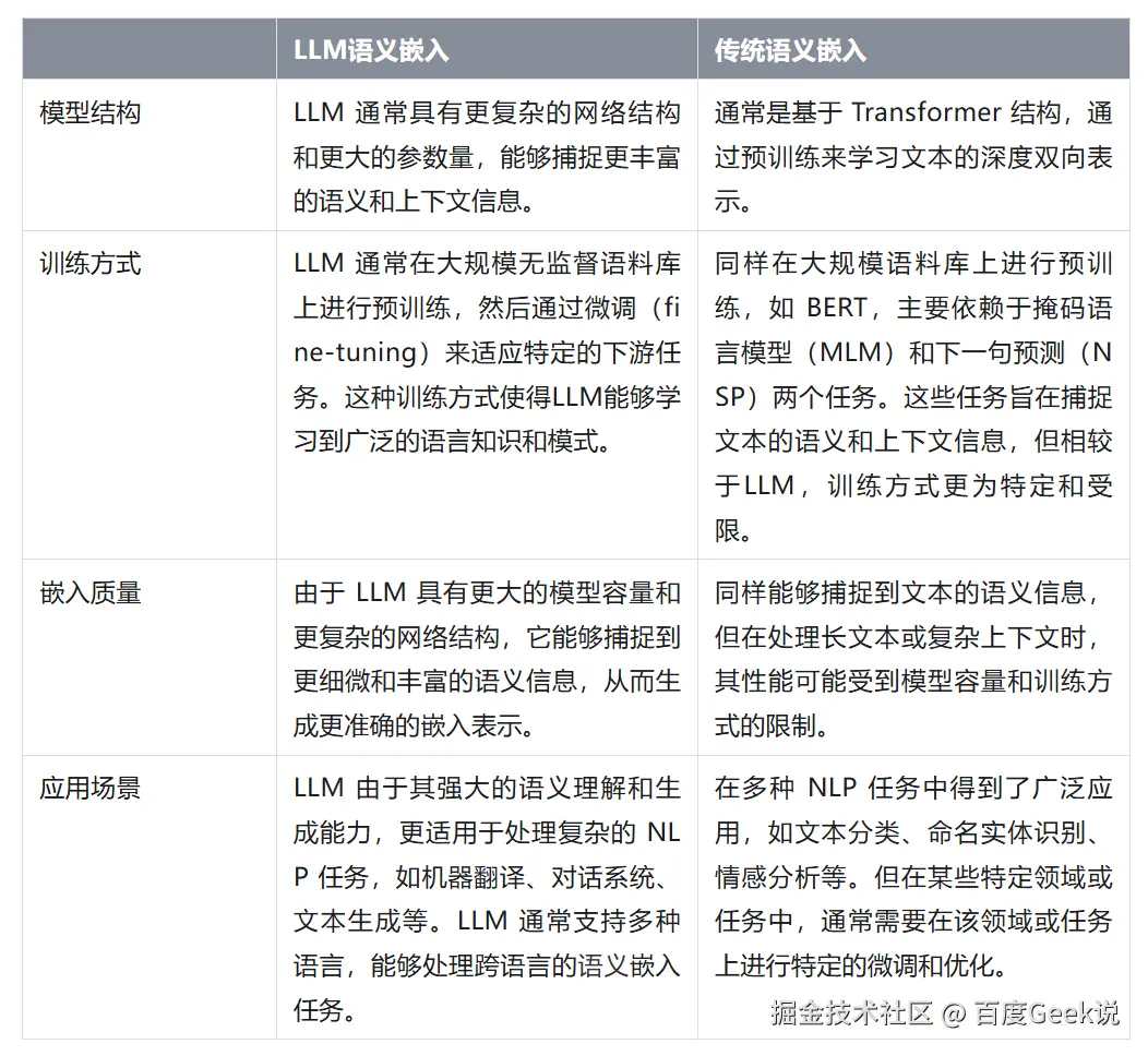 LLM 语义嵌入与传统语义嵌入之间的对比: