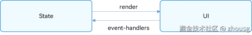 - State:状态,指驱动UI更新的数据。用户通过触发组件的事件方法,改变状态数据。状态数据的改变,引起UI的重新渲染。