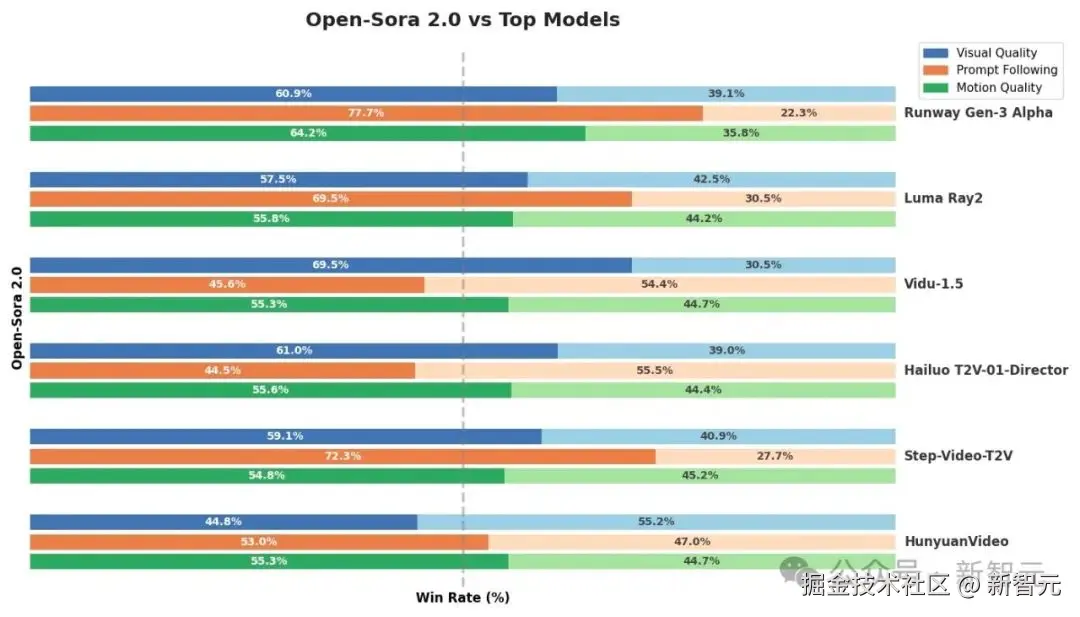 在视觉表现、文本一致性和动作表现三个评估维度上,Open Sora 在至少两个指标上超越了开源 SOTA HunyuanVideo,以及商业模型 Runway Gen-3 Alpha 等。以小成本获取了好性能。