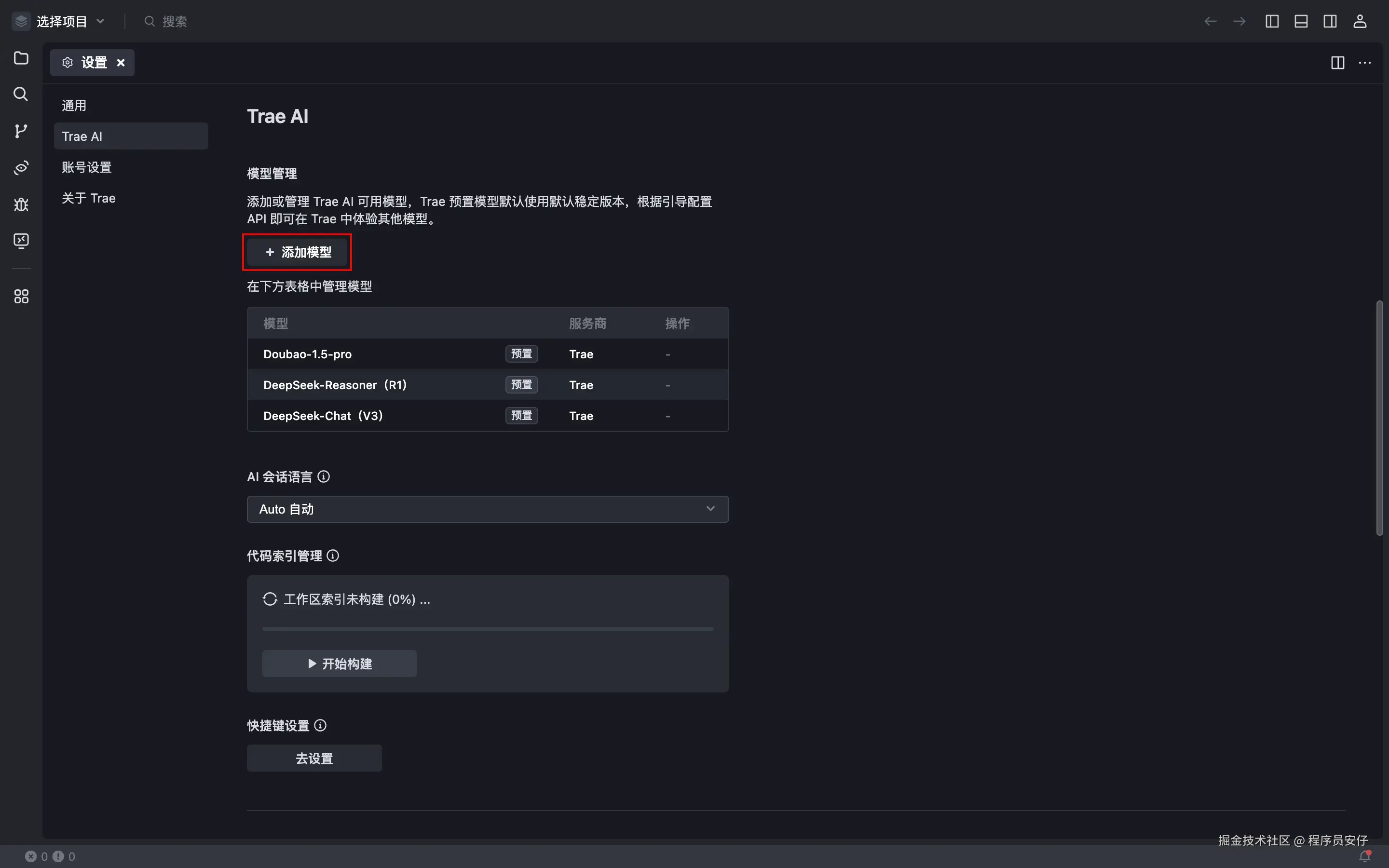 - 预置模型:Trae 内置的高性能模型,无需额外配置即可使用
