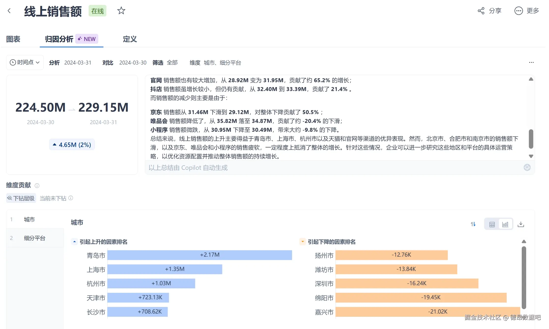 AI模型自动识别KPI变化背后的影响因子,帮助快速定位业务问题。