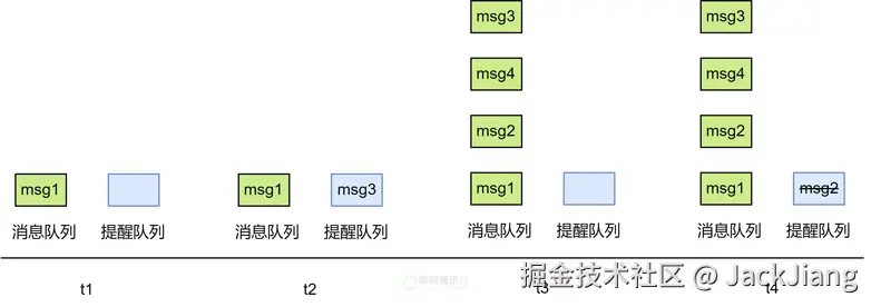 - 2) t2时刻收到服务端推送的 msg3 新消息提醒,放到提醒队列,此时用户看不到这条消息;