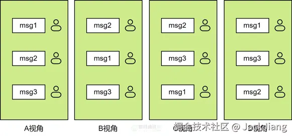 为什么要讲消息顺序,来看一个场景。假设群里有用户A、用户B、用户C、用户D,下面以 ABCD 代替,假设A发送了3条消息,顺序分别是 msg1、msg2、msg3,但B、C、D看到的消息顺序不一致。