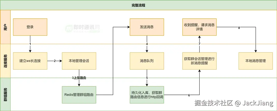 5) 用户在群里发布一条消息,消息通过 Websokcet 送达连接服务,然后经过连接服务—>消息队列—>群组服务,消息在群组服务里经过频控、安全检查、格式转换等一系列流程后入库,持久化;