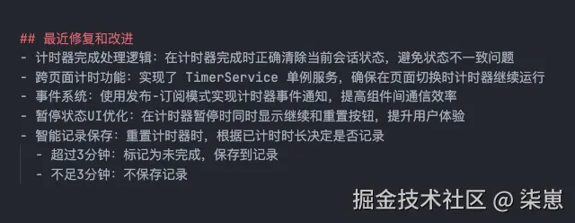 - 计时器完成处理逻辑:在计时器完成时正确清除当前会话状态,避免状态不一致问题