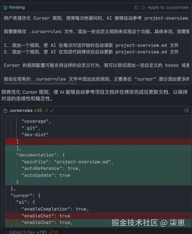 优化 rule,目的是每当我提问的时候,可以参考project-overview.md学习项目资料,当 AI 修改完成时 ,更新project-overview.md文件。以保持对话的连续性和稳定性。