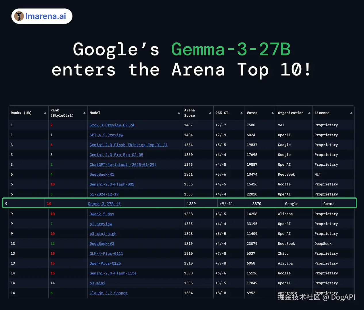 Gemma 3 在多个 AI 评测榜单上超越了 Llama 3-8B、DeepSeek-V3、Mistral 7B,并且能够在单 GPU 上运行。