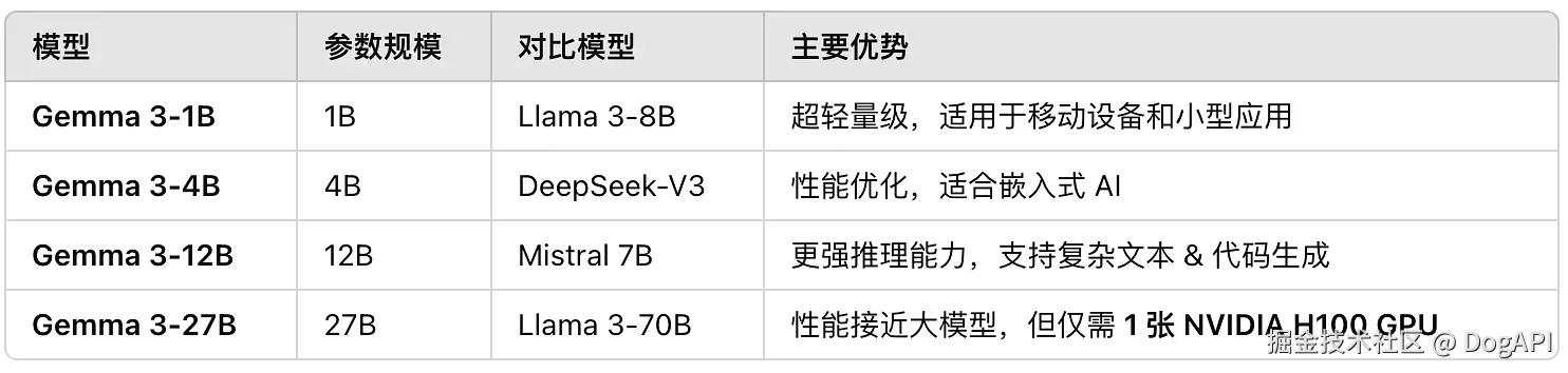 - Gemma 3 27B 仅需 1 张 NVIDIA H100 GPU 即可运行,相比其他模型(如 Llama 3 70B)所需的 32 张 H100,计算成本大幅降低。