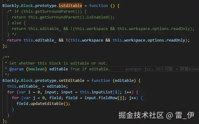 (3) setEditable方法是禁用积木编辑功能,开启后内置输入框积木将不可编辑,isEditable方法是用于检测积木是否是可编辑状态,如果是内置积木会根据主积木的编辑状态变化,即下方已注释的代码