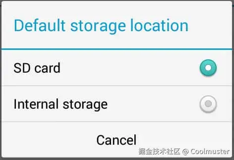 注意: 但是,请务必注意此功能有局限性。由于安全或性能原因,某些应用程序可能仍选择将部分数据存储在内部存储上。例如,需要快速访问常用数据的应用程序可能会将某些数据保留在更快的内部存储中,即使默认存储设置为 SD 卡也是如此。